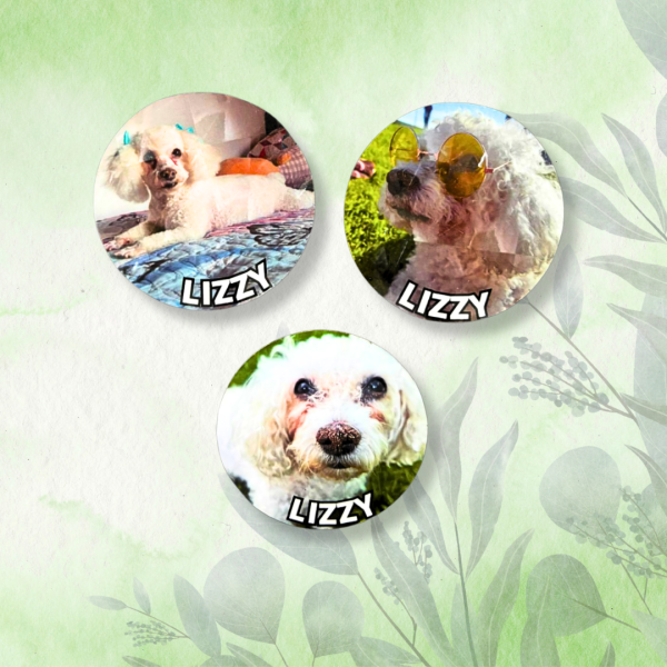 Personaliza tu pin con la foto de tu mascotica y colócalo en cualquier superficie metálica, incluye imán.